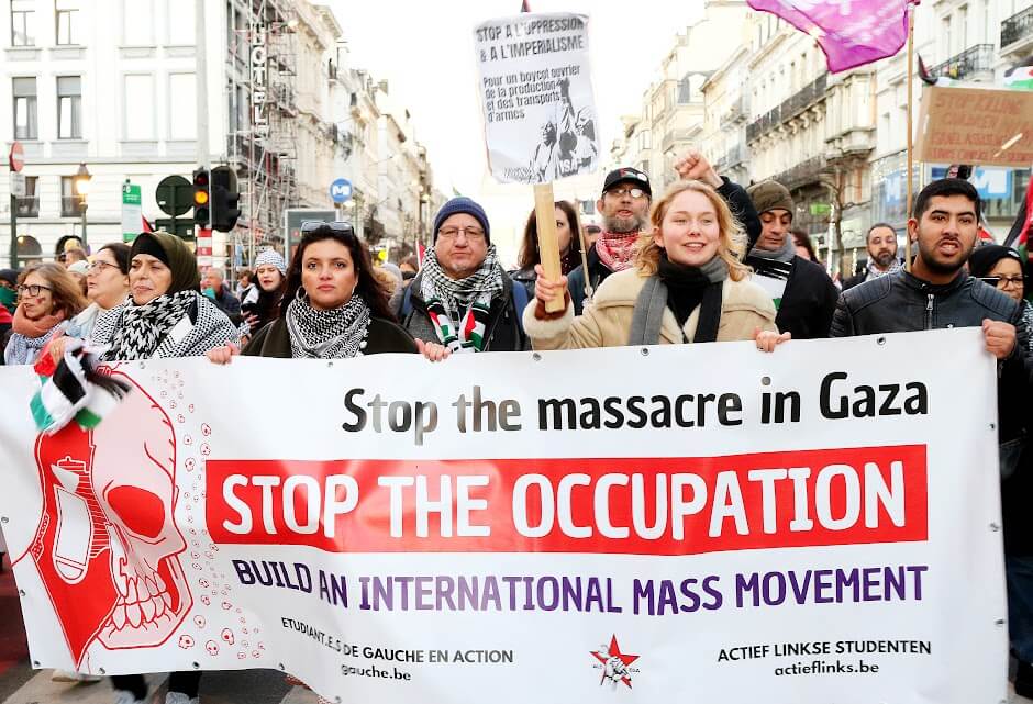 Massale betogingen als deze hebben regeringen al gedwongen om terug te komen op hun aanvankelijke openlijke steun aan het Israëlische staatsterrorisme. Ook de Belgische politici staan onder druk. Premier De Croo werpt zich op als verdediger van een staakt-het-vuren. Tegelijk voert zijn regering een beleid dat het oorlogsgeweld en de bezetting blijft steunen. Zo is staatsbank Belfius betrokken bij projecten in bezet gebied. Op de luchthaven van Luik is militair materieel naar Israël gepasseerd. Staatssecretaris De Moor voert ondertussen de repressieve aanpak van Palestijnse vluchtelingen op.